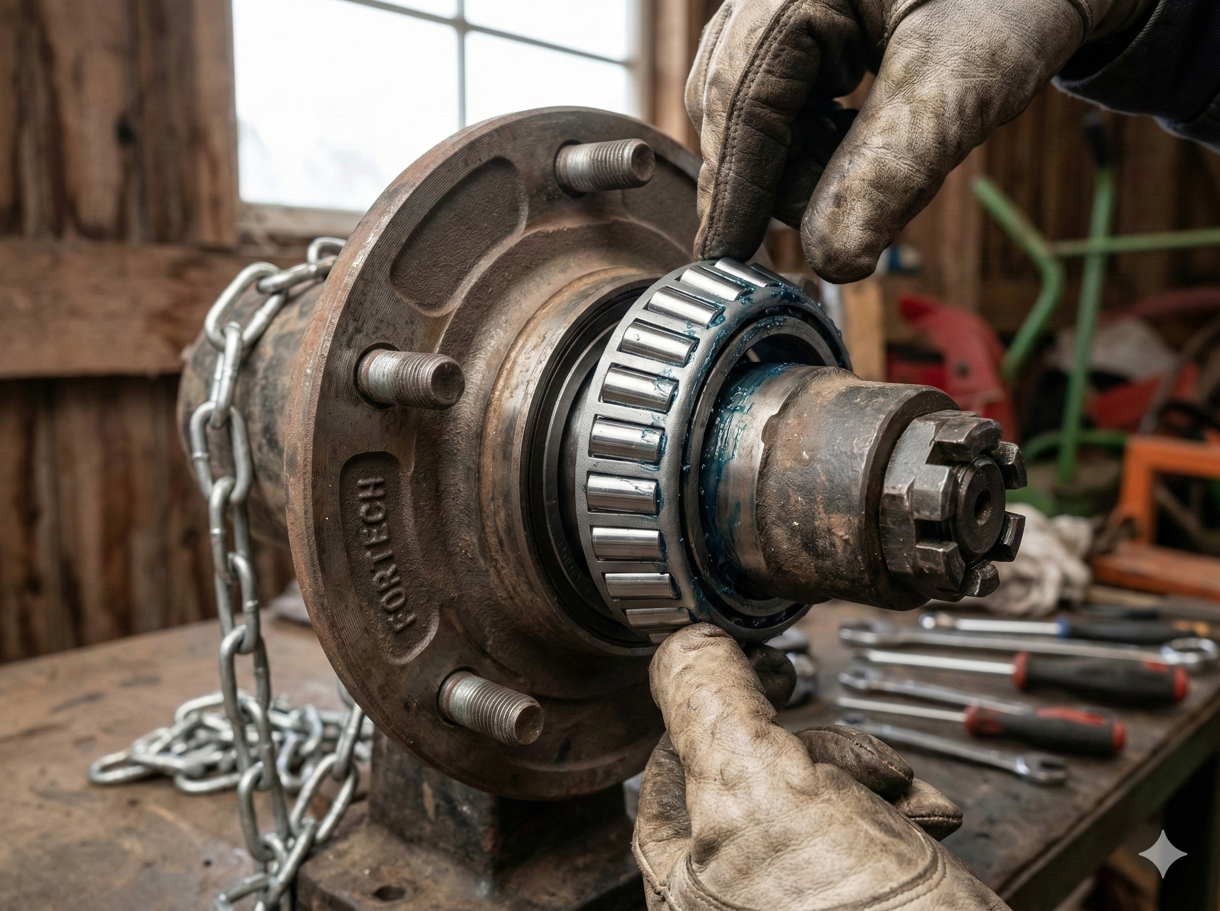 A durabilidade do seu reboque depende do que você não vê. Este close técnico "explodido" revela a qualidade interna do cubo de roda Fortech. Mostramos aqui o rolamento de rolo cônico de precisão sendo montado em uma base metálica robusta, protegido por uma película de graxa industrial azul especial contra aquecimento e corrosão. O cubo metálico, com o logotipo "FORTECH" gravado na face, possui espessura de chapa reforçada e fixação por parafusos de alta resistência. O sistema inclui porca castelo e pino de segurança para garantir a fixação precisa. Confie na engenharia Fortech para um movimento suave e uma longa vida útil.