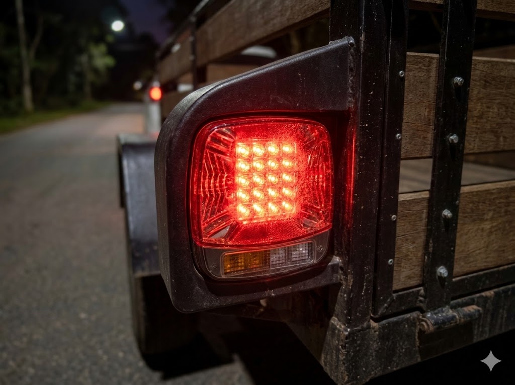 Segurança e visibilidade são prioridades com o sistema de sinalização traseira Fortech. Esta lanterna utiliza tecnologia LED moderna, proporcionando uma luz de freio vermelha intensa e de resposta imediata, essencial para alertar os motoristas em qualquer condição climática ou de luminosidade, como demonstrado neste close noturno em asfalto molhado. A carcaça de plástico robusto protege os circuitos eletrônicos contra vibrações, poeira e umidade. Além da luz de freio principal, o módulo inclui indicadores de direção em âmbar e luzes de ré brancas integradas. Garanta que seu reboque esteja sempre visível e em conformidade com as leis de trânsito.